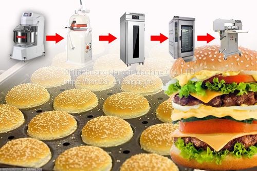 Full set hamburger production machines: dough mixer, dough divider and rounder, proofer, baking oven, bread slicer.