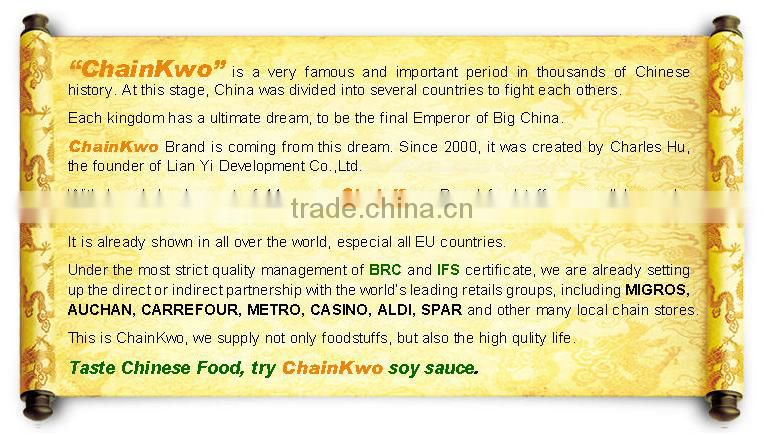 ChainKwo Brand soya sauce is used for seasoning soups, meat and fish dishes, salads, pasta and rice. It makes them delicious with a fresh color and perfect aroma.