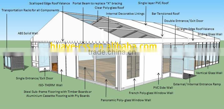 HUAYE Tent Manufacture Co.,Ltd is an industry leading company specialising in the design, manufacture and supply of temporary and semi-permanent clear-span demountable tent systems. It supplies both the private and public sectors including the hospitality and events industry, the military, aid organisations, retail and general industry.