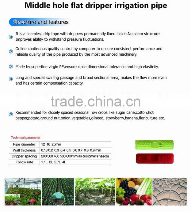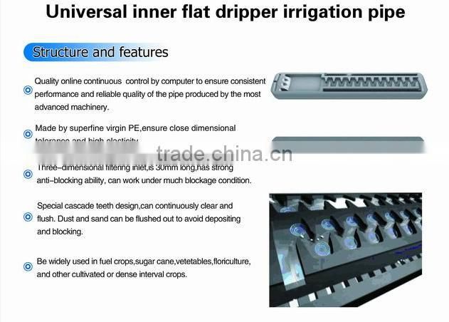 The flat dripper irrigation pipe means the dripper is inserted into inner irrigation pipe became as integration.the inner pipe is smooth.the pipe can be easy installed,low cost ans less investment.the dripper with self-filtering windows,good anti-blocking performance.irrigation pipe adopt labyrinth path,with a certain degree of pressure compensation.the dripper distance of pipe can be adjusted by customer’s requirements.the irrigation pipe widely is used in cotton,vegetables,greenroom,fruit forest and economic crop irrigation.