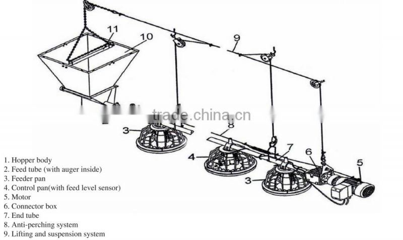 *The height of feeder pan is very important for chicken growing ,it is very conenient to adjust the feeding line height by winch.The best height of feeding line is :chicken back height and feeder pan up grill should at the same level.