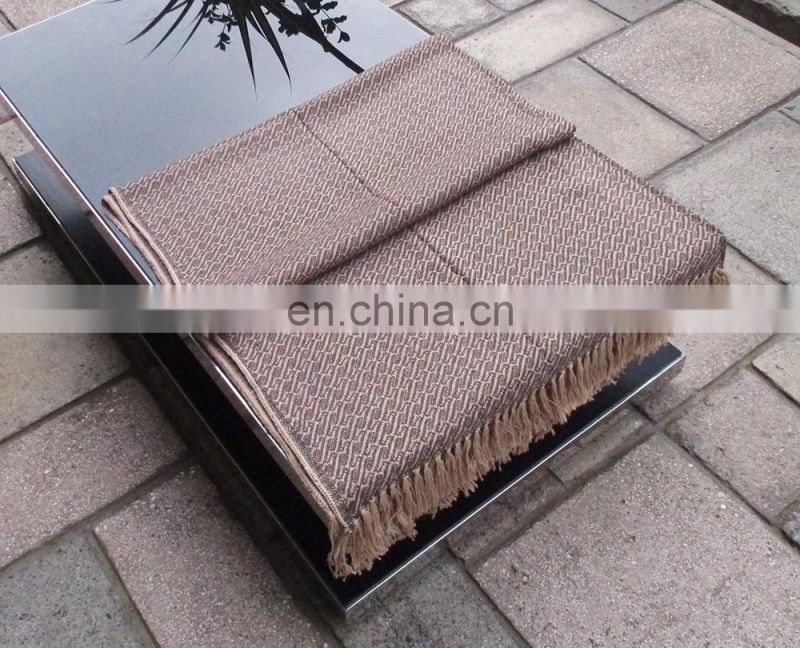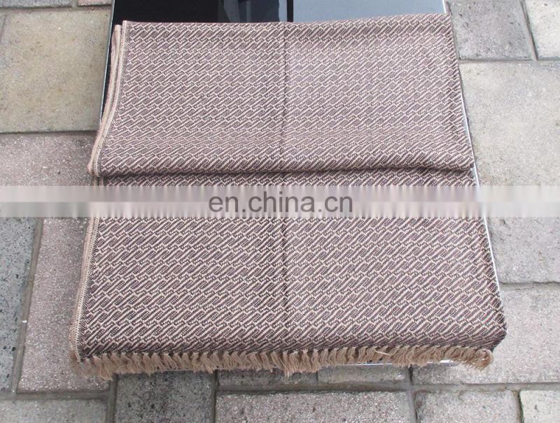 Alpaca throw blanket of brown with beige color. Alpaca wool and acrylic throw with fringes in the borders. It serves to shelter or to decorate armchairs and tables. You can mix colors in your order