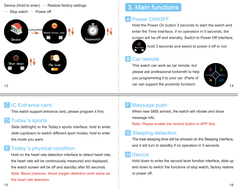 1.Generate as smart key 2.Sport monitoring 3.Heart rate monitoring 4.Blood pressure monitoring 5.Time,date,stopwatch... 6.SMS message reminder 7.Access card 8.More functions will be updated Package includes: